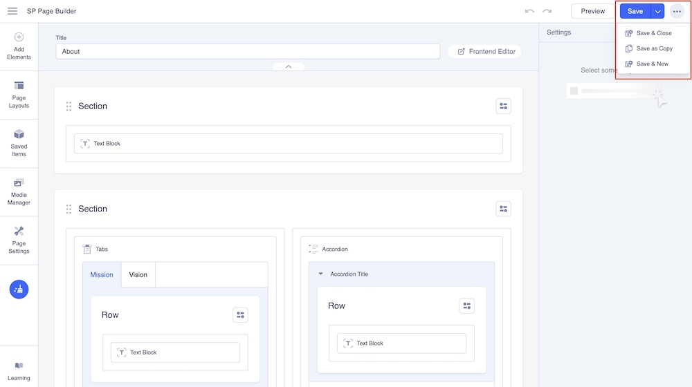 Save & Close: This will save your current page and take you to the SP Page Builder dashboard.