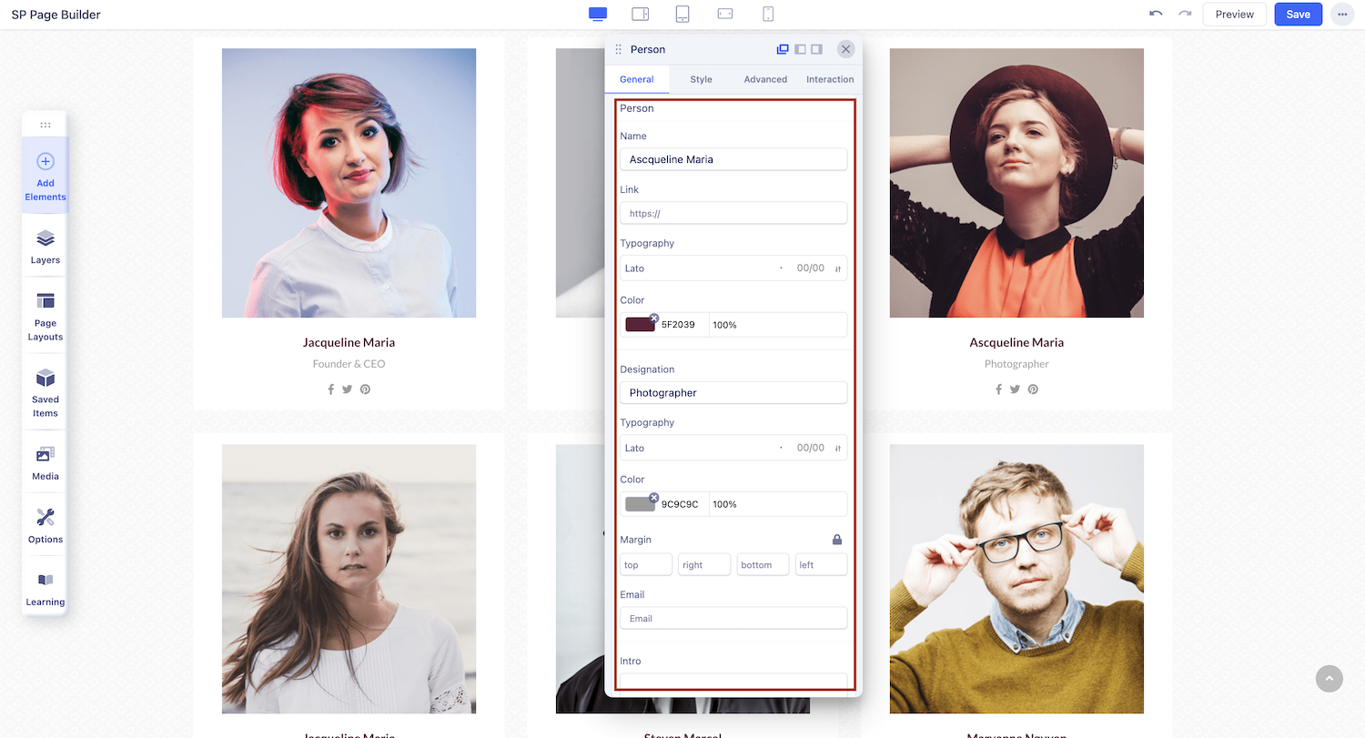 You can add a Person addon to your page from the SP Page Builder sidebar. Simply drag the addon from the Addons panel and drop it on the section of the page where you want to add a Person addon.