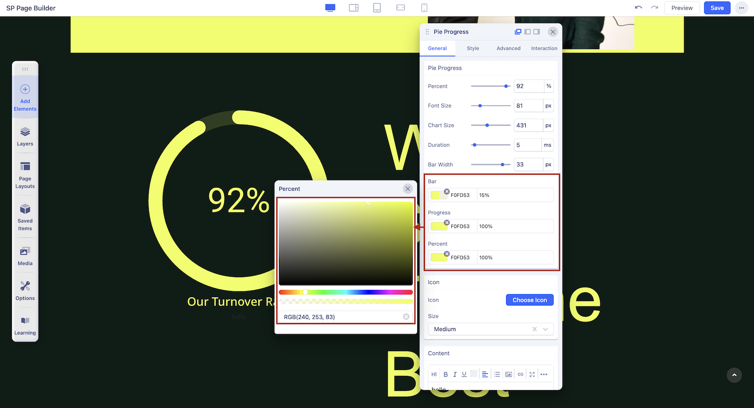 Change your Pie Progress’s color scheme using the Color Settings. Click on the Circle icon from the inline editor to open this window. Here, you will be able to change the color for the Bar, Progress, and Percent. Clicking on the color box will open the Color Picker window where you can easily select the color you want.